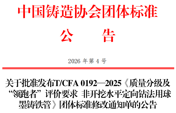 中国铸造协会批准发布T/CFA 0192—2025《质量分级及“领跑者”评价要求 非开挖水平定向钻法用球墨铸铁管》团体标准修改通知单,自2026年3月1日起实施。