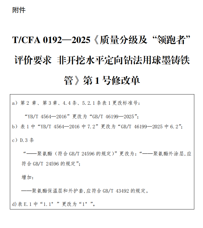 T/CFA 0192—2025《质量分级及“领跑者”评价要求 非开挖水平定向钻法用球墨铸铁管》第1号修改单